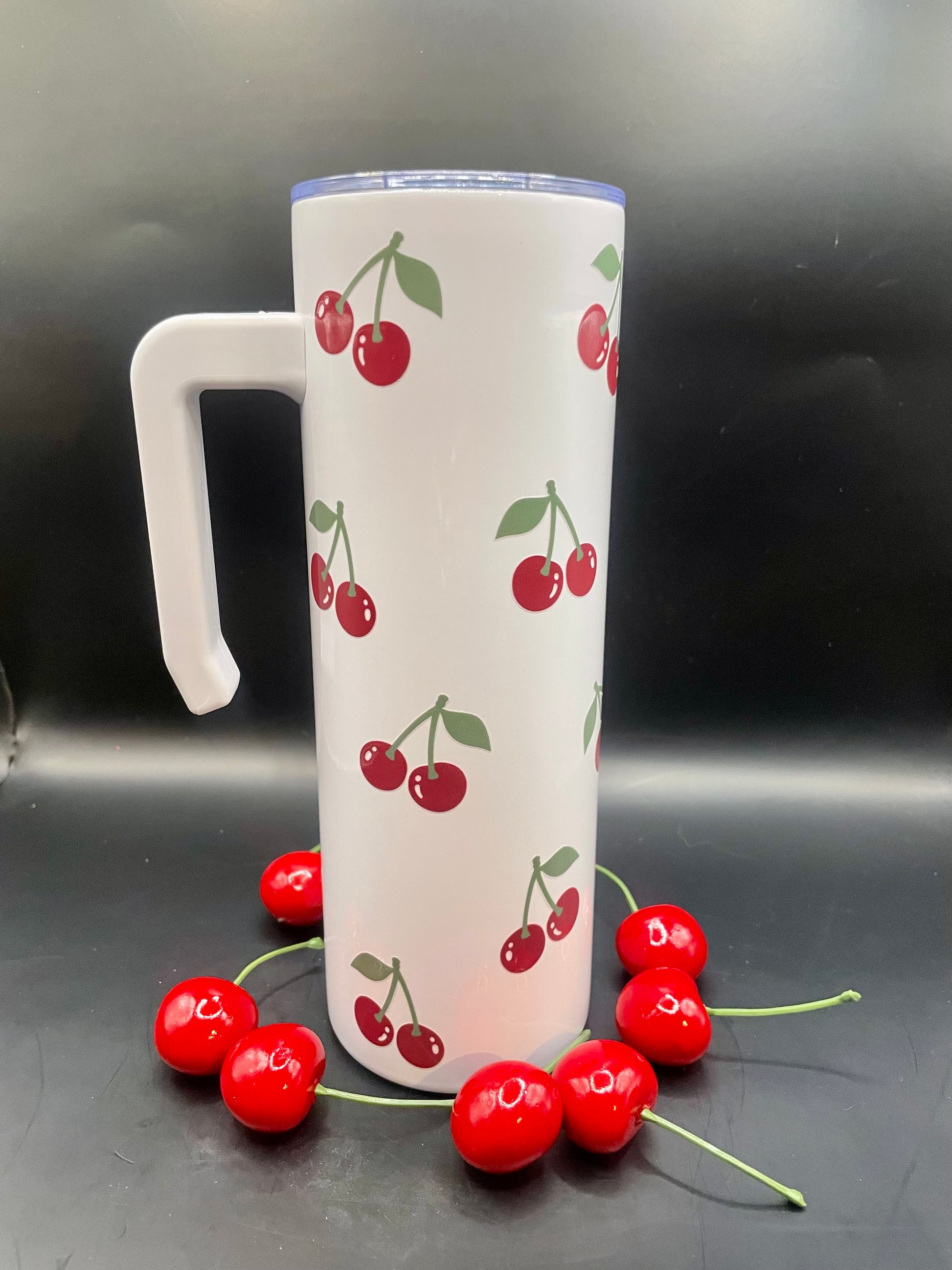 20oz double-walled tumbler with handle, featuring UV DTF cherries. This version includes a regular lid and a straw. These beauties are in limited supply, so don’t miss out!